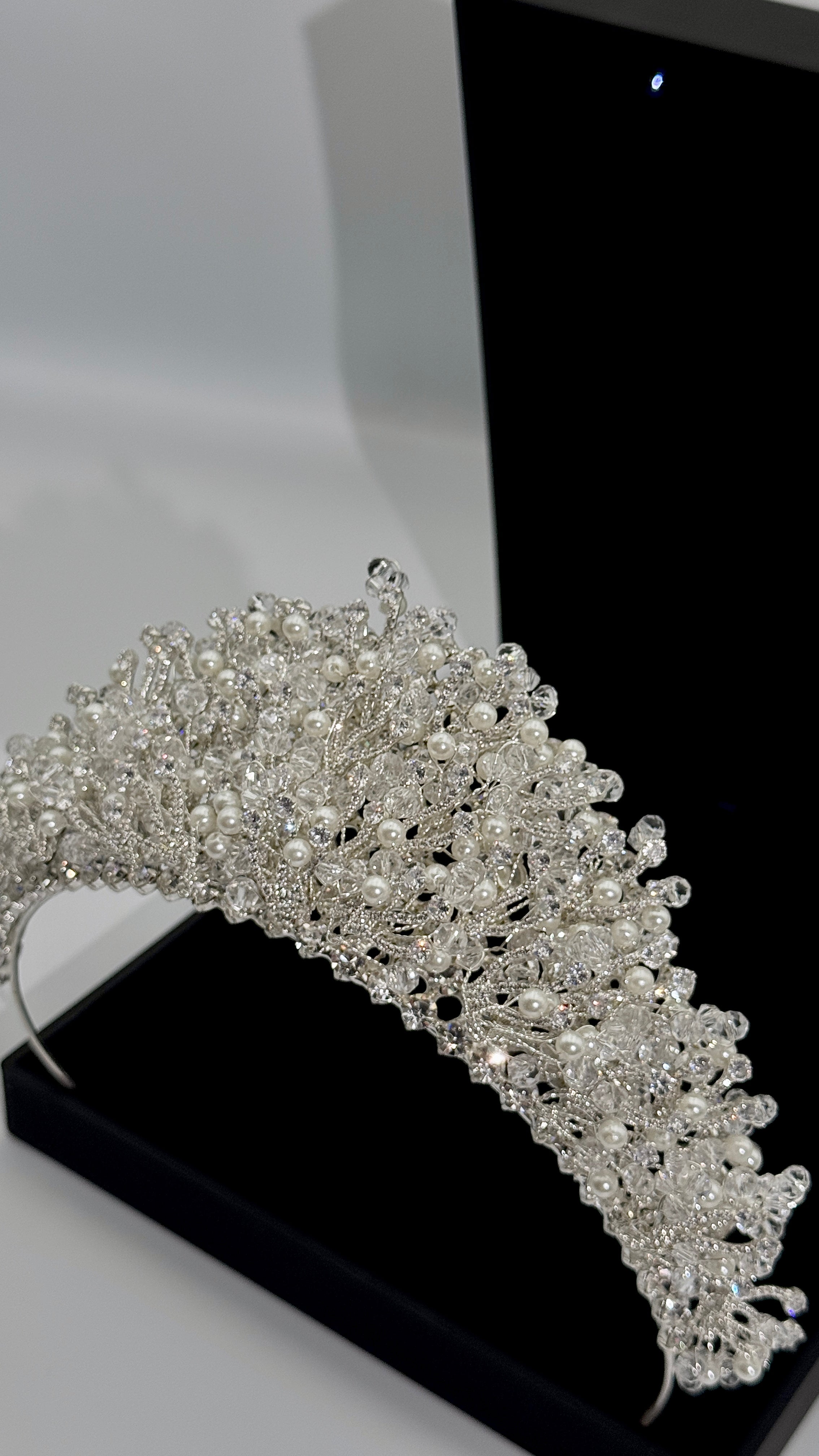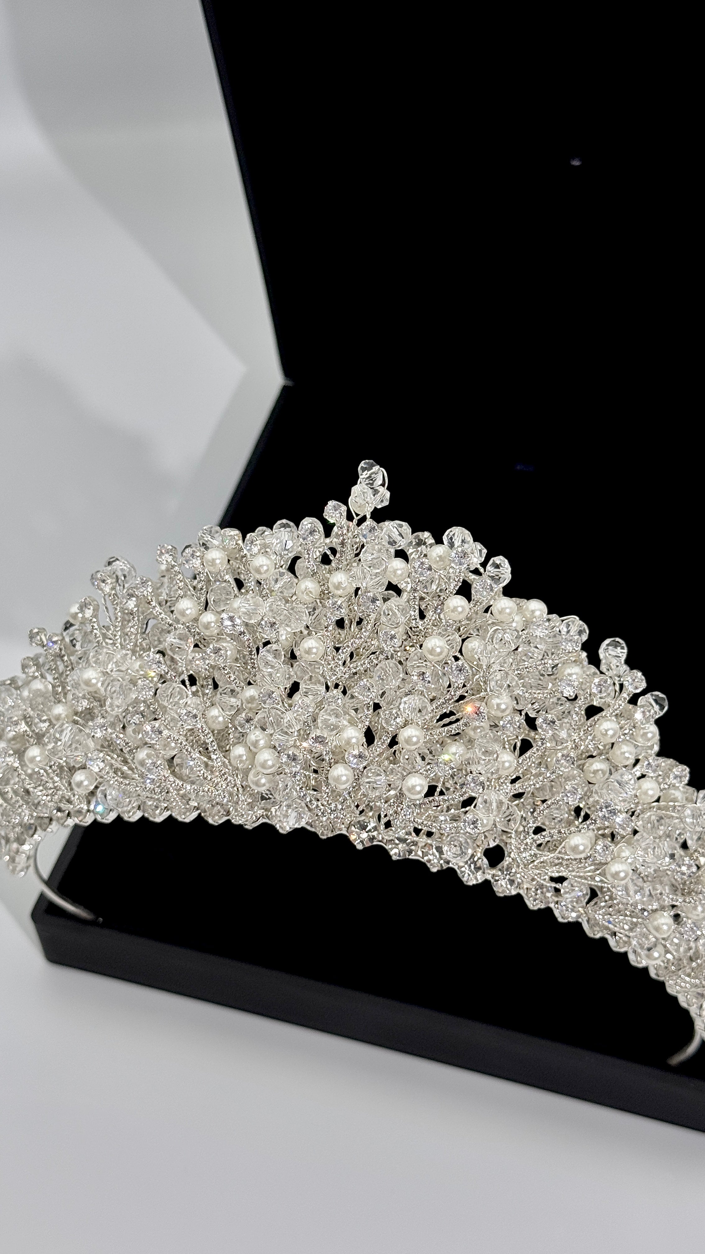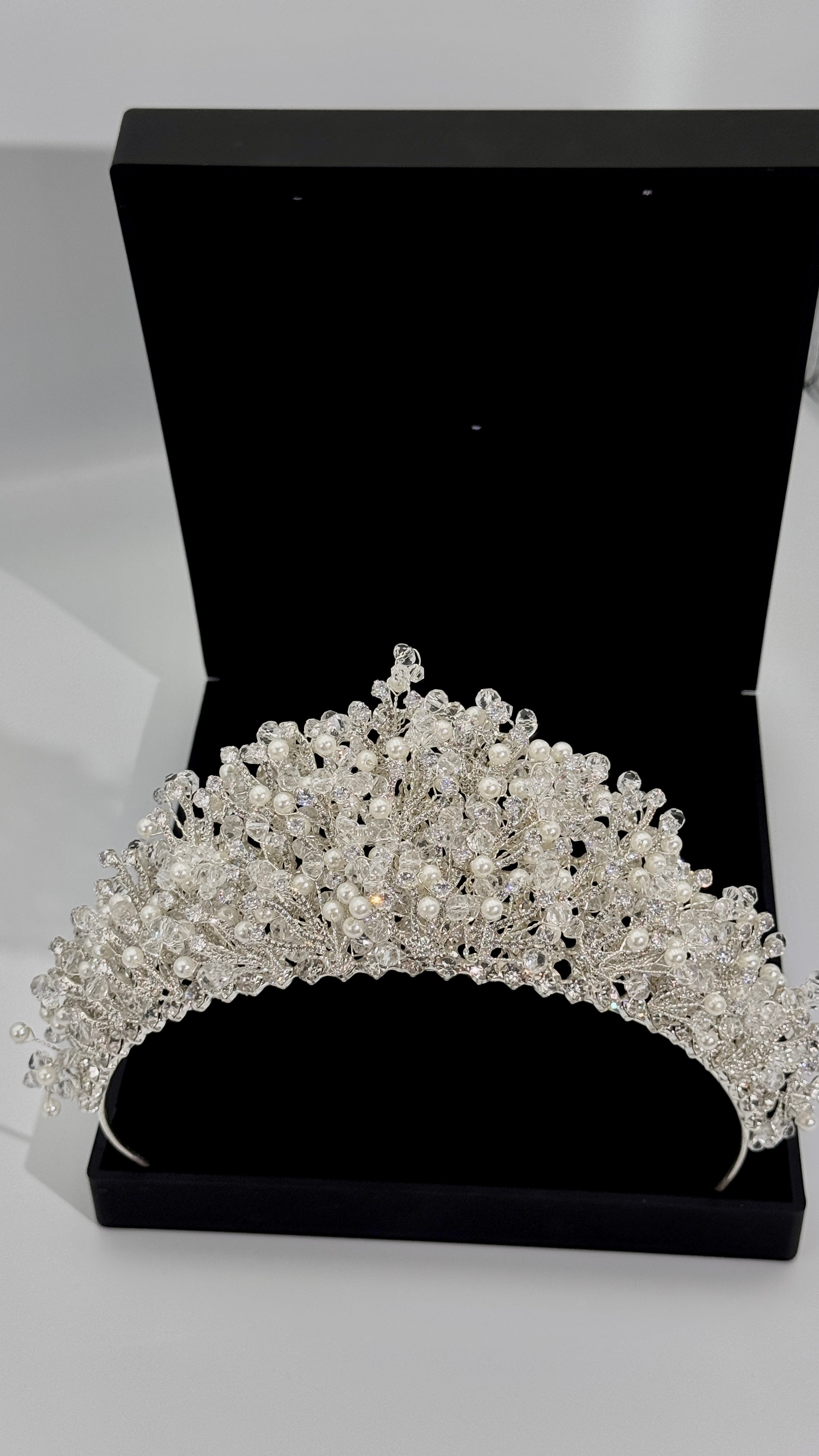 ✨ Design: Elegant bridal crown with crystal and pearl detailing